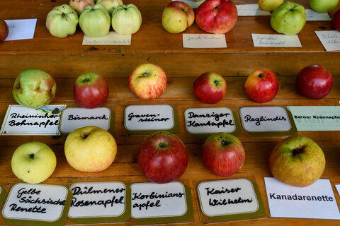 Wer eigene Obstsorten mitbringt und bestimmen lassen möchte, kann das bei den Pomologen Dr. Werner Schuricht und Hans-Jürgen Mortag tun. Einblick in die Vielfalt der Obstsorten geben eine Obstsortenschau sowie pomologische Literatur.