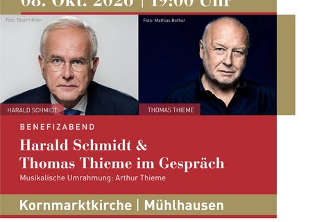Thomas Thieme zählt zu den bedeutendsten deutschen Film-und Theaterschauspielern. Bekannt wurde er durch Filme wie "Der Untergang", "Das Leben der Anderen" und das Doku-Drama "Uli Hoeneß-Der Patriarch". Harald Schmidt gilt als der Pionier und prägendste Moderator der deutschen Late-Night-Show nach amerikanischem Vorbild. Mit bissigem Humor und intellektuellem Anspruch revolutionierte er das Genre und wurde zu einer TV-Legende. Während der bundesweit bekannte Entertainer, Schauspieler, Kabarettist und Kolumnist Harald Schmidt erstmals in Mühlhausen/Thüringen gastieren wird, ist Thomas Thieme seit Jahren regelmäßiger Gast des Freundeskreises Mühlhäuser Museen, erinnert sei an "Fünf Stellvertreter", "Das Leben des Galilei", "Faust Hoch 3" und "Baal". Harald Schmidt und Thomas Thieme schätzen und mögen einander sehr, wie die beiden Protagonisten des Abends künstlerisch zusammengekommen sind und welche Intentionen sie einen, werden die Besucher erfahren...