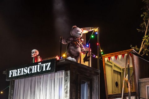 „Ins Schwarze getroffen“, jubelte Carl Maria von Weber nach der Uraufführung seines „Freischützes“[*]1821 in Berlin. Schon bald trat das Werk seinen Siegeszug durch Europa an, und ist auch in Meiningen mit sechs Neuinszenierungen seit 1945 sehr beliebt. Webers Stoff aus einem alten Gespensterbuch traf den Nerv der Zeit und noch heute berührt die Geschichte um Max, der sich dem Teufel verschreibt, um seine Braut zu gewinnen. Der Wald, Inbegriff der „deutschen Seele“, wird zum Kampfplatz zwischen Gut und Böse.Eine Jägergemeinschaft pflegt ihre alten Rituale: Um Förster Kuno zu beerben und seine Tochter Agathe zu heiraten, muss der treffsichere Jungjäger Max einen Probeschuss bestehen. Aber Leistungsdruck und Versagensangst führen dazu, dass er auf einmal nur noch daneben zielt. Heimlich gießt er in der Wolfsschlucht mit Hilfe des zwielichtigen Kaspar magische Freikugeln, die ihm den Sieg sichern sollen. Doch nur sechs gehören dem Schützen – die siebte lenkt der Teufel.Die Musik enthält volksliedhafte Elemente wie Hörnerschall und fröhliche Jäger- und Brautjungfern-Chöre. Die Welt der Dorfgemeinschaft kontrastiert mit finsteren Klängen einer abgründigen Welt, womit Weber den Schritt in die Romantik vollzieht und zum Wegbereiter Wagners wird. Die Oper ist Nationaloper, Geisterspuk und Menschheitsdrama zugleich.