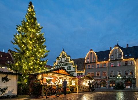 Ganz muss man auch in Weimar auf die Tradition des Weihnachtsmarktes nicht verzichten. Der tägliche Wochenmarkt (außer sonntags) mit seinen Gemüse- und Lebensmittelhändlern ist erweitert um weihnachtliche Hütten, die Kunsthandwerk, Dekoration, Spielzeug und andere Geschenke anbieten. Auch einheimische Geschäfte sind dabei und freuen sich über das Interesse, das sie wecken. Im Zentrum des Marktplatzes steht der beleuchtete Weihnachtsbaum und die Hütte mit den Krippenfiguren des Weimarer Holzbildhauers Christian Gramm.