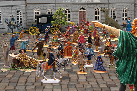 Zinnfiguren werden in einer acht Meter langen Dioramen-Wand und in 23 Vitrinen zu sehen sein. Bereits im Jahre 1956 gab es im Weimarer Stadtmuseum eine große Zinnfigurenausstellung, die einzige gesamtdeutsche nach dem Zweiten Weltkrieg und vor dem Mauerbau. Eine weitere viel beachtete Schau folgte am selben Ort 1976. Die Exponate der Jubiläumsausstellung zeigen Darstellung mit meist lokalem Bezug zu Weimars Geschichte. Zinnfigurensammler aus ganz Deutschland haben Exponate bereitgestellt.