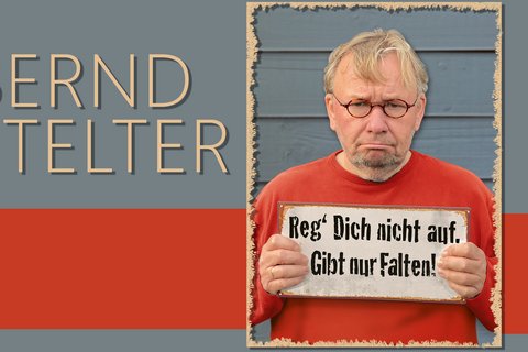 “Reg‘ dich nicht auf. Gibt nur Falten!“ ist das neue Programm von BERND STELTER. Es gibt eine Menge zu Lachen. In zwei Stunden werden Falten geglättet, das Hautbild verbessert und die Mundwinkel nach oben gezogen. Es ist quasi eine Zwei-Stunden-Beautybehandlung ganz ohne Botox und lästige Schönheitschirurgen.