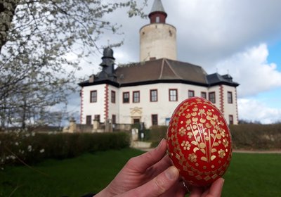 Im Osterferien-Programm "Hartgekochte Eier-Fakten", von 28. März bis 19. April 2026, führt Henne Henriette Ferienkinder durch die Burg Posterstein.