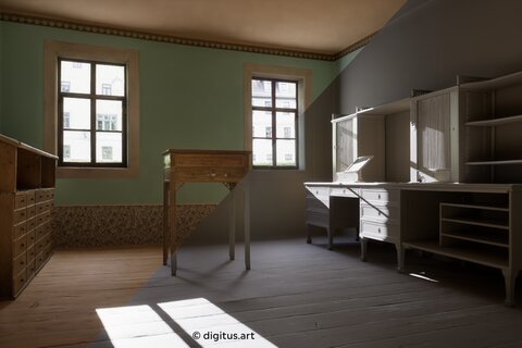 Der „Goethe-Apparat“ ist das neue ‚Werkzeug‘ für Besucher*innen, um die Arbeitswelt Goethes, aber auch die Zeitschichten des musealen Raumes spielerisch zu erkunden. Ein besonderes Highlight des interaktiven 3D-Visualisierungs-„Apparates“ ist der Zeichentisch aus Goethes Besitz. Dieser ist mit all seinen Funktionen und Schubfächern virtuell bedienbar: Mithilfe von Controllern können Schubladen geöffnet werden, virtuelle Gegenstände bewegt und betrachtet werden.