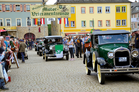 Ab ca. 8:00 Uhr morgens können die Fahrzeuge auf dem Saalfelder Marktplatz bestaunt werden bzw. am Nachmittag ab ca. 15:30 Uhr noch einmal, denn ab da ist Zieleinfahrt der Teilnehmer auf dem Markt. Start der Ausfahrt: 10:00 Uhr