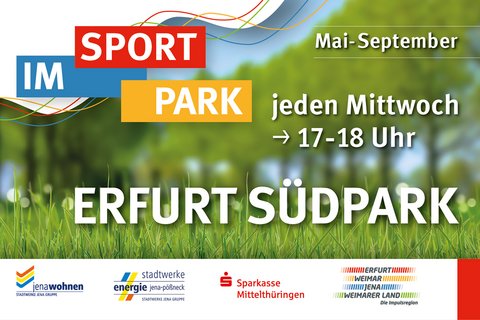 „Sport im Park“ ist ein offenes, kostenloses und unverbindliches Sport- und Bewegungsangebot für die Bürger in Thüringen, in Erfurt, in DEINER Stadt. Das Konzept ist denkbar einfach: Mitmachen – Ausprobieren – Spaß haben! Egal ob Anfänger oder erfahrene Sportler. Die Impulsregion bietet mit dieser Veranstaltungsreihe ein abwechslungsreiches und kostenloses Gesundheits- und Fitnesstraining für alle Altersgruppen, Outdoor und bei jedem Wetter. Angeleitet durch qualifizierte Übungsleiter/innen, erwartet Sie ein abwechslungsreiches Sportangebot von Aerobic bis Zumba.