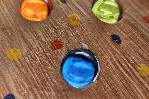 Wir fangen die letzten warmen Strahlen der Sonne ein. Aus selbstgesägten Baumscheiben und Glasmurmeln basteln wir bunte Lichtfänger für drinnen und draußen.
